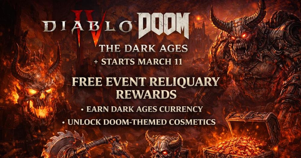 Diablo IV’s DOOM: The Dark Ages crossover begins March 11 with a free event reliquary and 10 cosmetics. Here’s what you get.